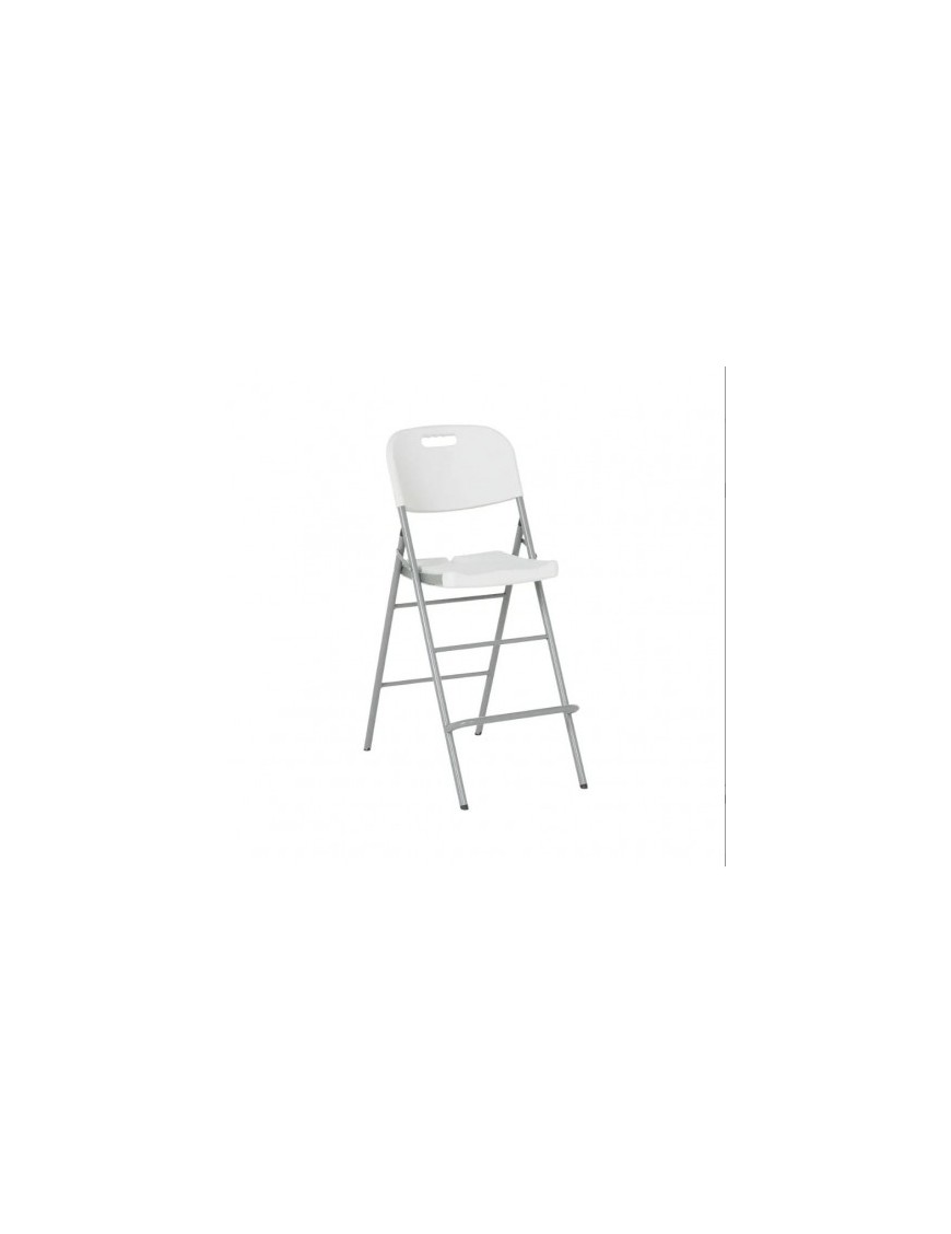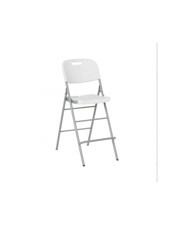 Sgabello alto pieghevole con schienale e poggiapiedi, ideale per banconi bar o isole cucina. Questo modello è caratterizzato da una struttura in acciaio verniciato e una seduta/schienale in plastica HDPE bianca dotata di una maniglia integrata per facilitarne lo spostamento.